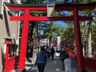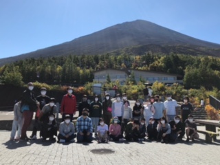 ?富士山5合目で、富士山山頂をバックに記念写真を撮りました。富士山5合目には富士小御嶽神社があります。みんなで参拝します。