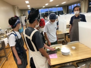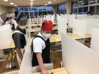 ときわ学級 連合移動教室15 公開日 2021/10/04 更新日 2021/10/04 ときわ学級 担当の係が夕食の準備をしています。ソーシャルディスタンスをとるための席と席の間仕切りがすごい圧迫感ですね。係の生徒たちは頑張って準備を進めています。