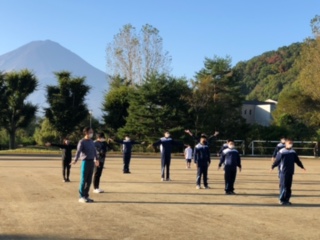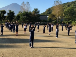 朝礼でラジオ体操をしています。体をしっかり動かして、今日も一日頑張るぞ!