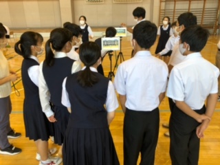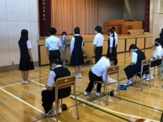 2年生 職業マナー講座 公開日 2021/10/08 更新日 2021/10/08 できごと 後半は、6人ずつのグループで挨拶の仕方のグループワークを行いました。指導が終わったグループはタブレット前に移動して挨拶をしているところを正面、横向き撮影します。自分の挨拶の仕方が教えていただいた通りできているのか自己チェックするためです。自分が挨拶をしているところを客観的に見ることができる、よい機会になりました。