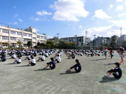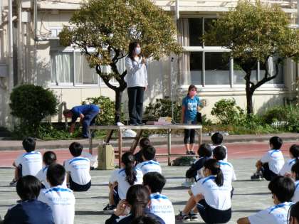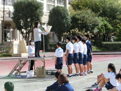 青空の下、全校朝会 公開日 2021/10/11 更新日 2021/10/11 できごと 清々しい朝となった今日、今年度初めて、全校生徒が揃って校庭で朝会を行うことができました。 校長先生からは、河口湖移動教室のお話や運動会に向けての励ましの言葉がありました。続いてソフトテニス部の表彰を行いました。