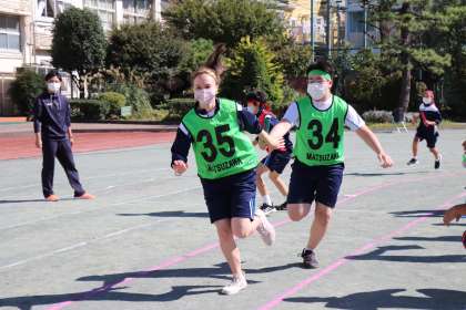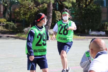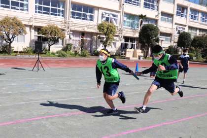 通常級の生徒と一緒に、全員リレーを行いました。 バトンをつなぎ、一生懸命走りました。