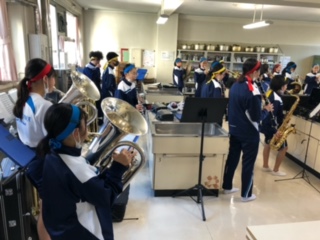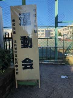昨日までの雨がウソのように晴れ渡った青空が広がっています。予定通り運動会を実施すべくいろいろな準備が進んでいます。入場行進を担当する吹奏楽部は、音出しをしています。運動会の立て看板、美術部作成の入退場門も準備完了です。