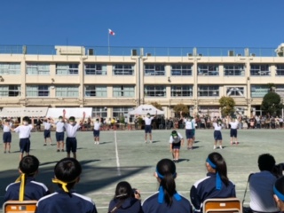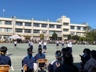 午後の部は、応援合戦から始まりました。最初はときわ学級、緑組です。元気よく拍子をきった後は、BTSのダイナマイトの音楽にのってダンスを披露しました。全校生徒の手拍子が響きます。生徒たちも、とても楽しそうです!
