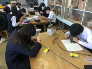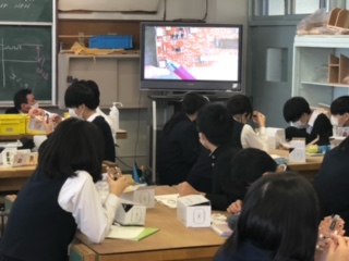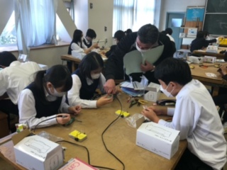 授業がんばっています!(3年生技術) 公開日 2021/11/11 更新日 2021/11/11 できごと 3年生の技術は『トランジスタのはんだづけ』に取り組んでいました。部品がズームされた大型テレビ画面を見ながら、生徒たちは真剣に作業を進めていました。