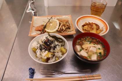 炊き込みご飯の上にある黒ゴマは、フライパンで炒って香りを出しています。ご飯には昆布を入れて炊き上げました。りんごのバター焼きには、シナモンがかかっています。ローズマリーやレモン、バターと美味しい匂いでいっぱいでした。