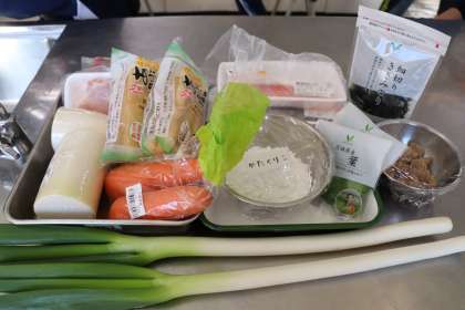 新年最初の調理メニューは、鮭ちらしとけんちん汁、黒糖のわらび餅です。