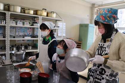 こんにゃくはスプーンを使って切っていきます。味が染みて美味しくなります。