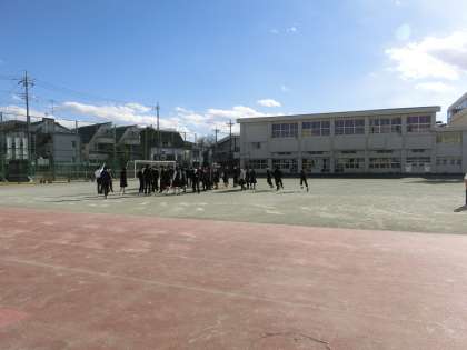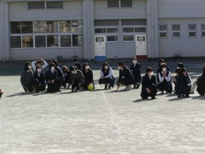 「訓練!訓練!」と放送が入ったのは昼休み。教室にいる人、廊下にいる人、更衣室にいる人、校庭にいる人、さまざまでした。いつもとは違う状況で少し時間はかかりましたが、冷静に避難することができました。校庭で遊んでいた人たちは、指示がある前に校庭の真ん中に座って待つことができていました。いつもなら、クラスで並んで避難するのですが、今日はみんなバラバラ。それでもできるだけまとまって避難する姿がありました。