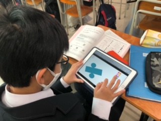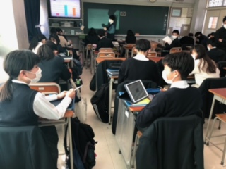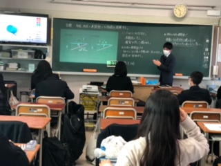 ロイロノートのアンケート機能を使っての授業の導入に、生徒たちは興味津々の様子。話し合い活動を通して互いの考えを共有したり、教科書のQRコードを読み取って立体から展開図をつくったり、実際の長さで展開図を描いて実測したりと、様々な学びを通して目標にアプローチした授業展開でした。生徒たちはとても熱取り組んでいました。
