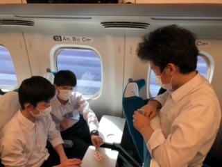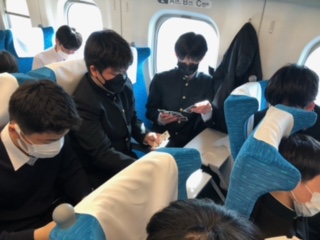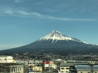 雪をかぶった富士山が進行方向右側に見えます。みんな思い思いに車内で過ごしています。