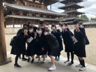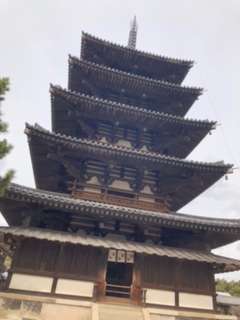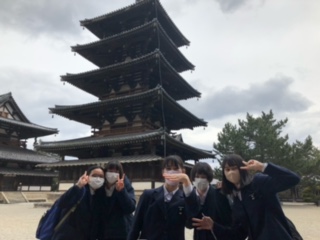 世界最古の木造建築物である五重の塔、圧倒されます。みんないい笑顔です。