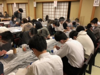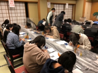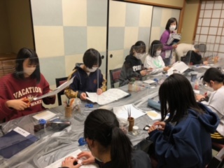 体験学習は「漆器加飾」を行います。下絵を漆器に写し、色を付けていきます。みんな真剣です。