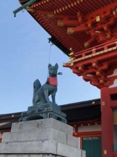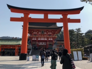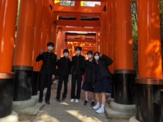 伏見稲荷です。タクシー行動している生徒たちと会いました。鳥居の朱色が素敵ですね。みんな楽しそうです!