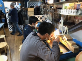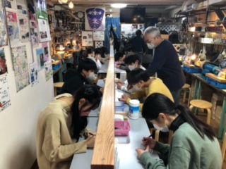 校外学習(2年生) 公開日 2022/03/22 更新日 2022/03/22 できごと 朝から3月とは思えない肌寒い一日ですが、2年生は浅草上野方面に校外学習に来ています。全班、伝統的な作品を創作する体験学習を組み込んでいます。 ここ「浅草 おじま」では、江戸切子の体験学習を行なっています。最初に説明を受けて、いざ!作品作りにチャレンジです!まずはコップに下絵を描いて、その線に沿って削っていきます。