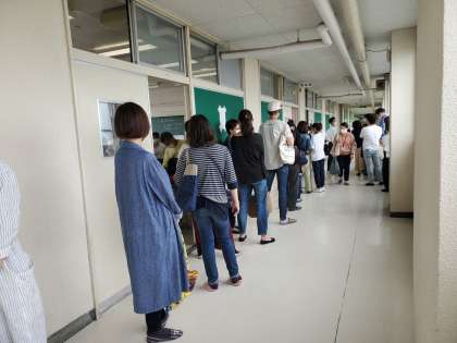 各クラスの前に保護者の皆さんに来ていただき、一人ずつ確認しながらの訓練です。災害時に向けての練習でした。