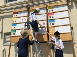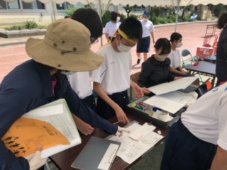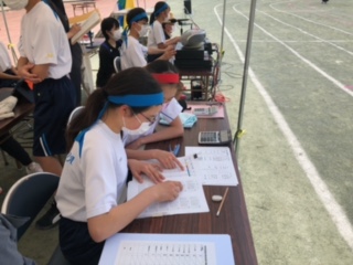 記録係は、決勝審判から流れてきた情報を計算して特典掲示板に掲示していきます。みんな真剣に取り組んでいます。