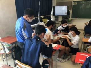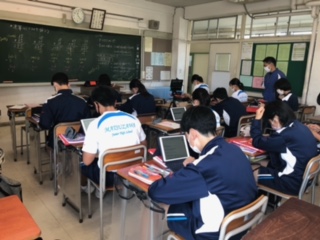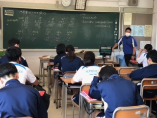 3年生数字の授業は、多項式の単元で「通算のしくみを探ろう」というところを学習していました。15×15=225 25×25=625 35×35=1225…となることに何か計算の仕方(法則)があるのか?ということについて、個々で予想を立てて、導き出した答えをグループで話し合っていました。授業中「へえ、なるほど」「すごいね」「そうか!」など新たな発見に気付いて前向きに授業に取り組む生徒たちの姿が見られました。