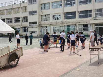 テントをはったり、校庭の石を拾ったり、入退場門を設置したり。明日の準備が進んでいます。