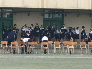 運動会 公開日 2022/05/21 更新日 2022/05/21 できごと 始まる直前、雨が降ってきました。一時待機しましたが、止んだので開催に向けて進めます。濡れてしまった生徒席を、各クラスの美化委員が雑巾で拭き取ってくれています。ありがとう!