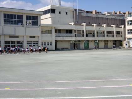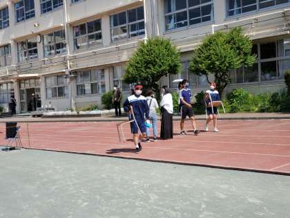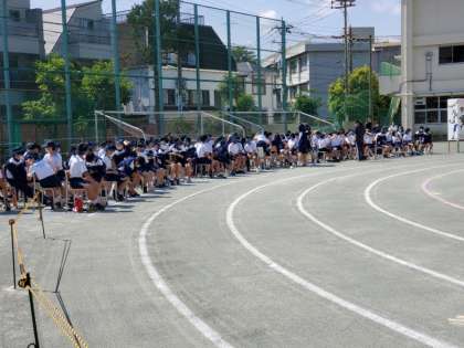 学活で指示を受けて、椅子を持って生徒席に着いています。