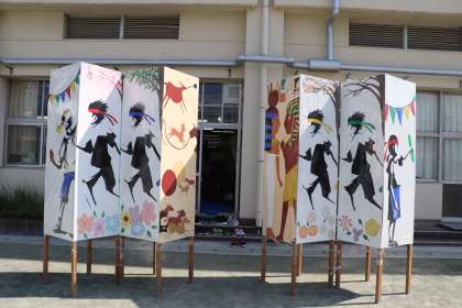 また、2枚目の写真にある赤や青、黄や緑のペイントは、ジャクソンポロックをオマージュして描きました。これは、全て2年生が2月から3月にかけて描きました。水に塗れても落ちない素材で板に直接描いてあるので、来年以降もこのままです。