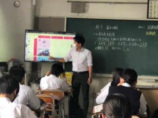 授業がんばっています!(2年理科) 公開日 2022/05/25 更新日 2022/05/25 できごと 2年理科の授業、本日のねらいは「周期表の元素について知る」です。元素の周期表の見方、意味、覚え方について先生が丁寧に説明していきます。先生が「H、He、Li、Be‥」と続く周期表について、リズムで覚える覚え方を披露すると、生徒たちは興味津々に口ずさんでいました。