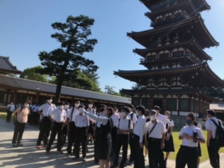 薬師寺に着きました。バスガイドさんから説明を聞いています。