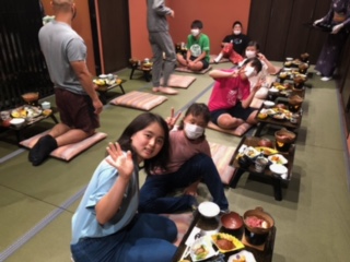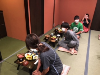 ときわ学級は、お風呂に入った後夕食です。みんなで食べます。「いただきます!」