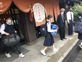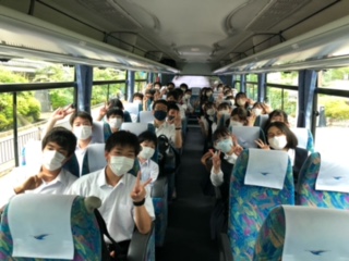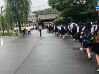 いよいよ宿を出発します。バスが停車している場所に向かいます。雨は上がっています。生徒たちは元気です。