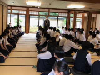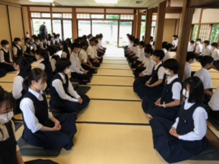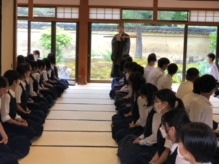 建仁寺での坐禅体験が始まりました。最初にお坊さまより坐禅についてのお話をいただきました。「姿勢と呼吸と心」を整えて臨むことが必要というお話でした。