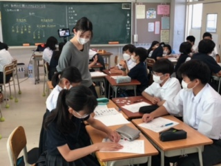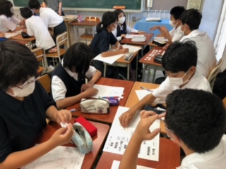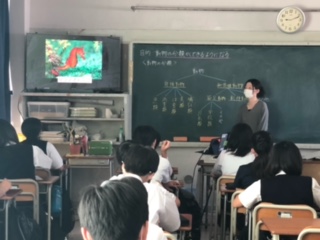 先生がエイやサンショウウオ、タツノオトシゴなどたくさんの動物の写真を画像で映し出し、生徒たちは今まで学習してきた知識をフルに働かせて分類をしていきます。途中で班で話し合う時間をいれると、生徒たちは活発に意見を出し合い、動物の分類を進めていました。