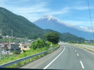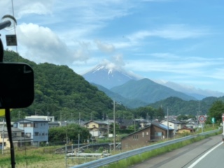河口湖線に入りました。雲の合間に富士山が見えます。