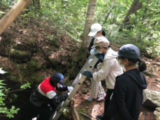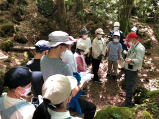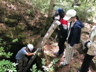 河口湖移動教室1日め24 公開日 2022/06/24 更新日 2022/06/24 できごと ガイドウォークは、ベテランのネーチャーガイドさんがグループごとに森の中を案内してくれます。時々立ち止まって溶岩樹形の説明や富士樹海の森の成り立ちなどをしてくださいます。溶岩樹形のたて穴に入ります!