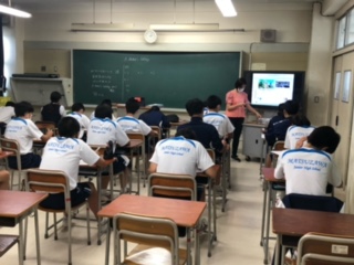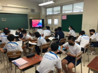 3年生の英語の授業は、英会話Activityや、リスニング、本文の内容確認、ALTの先生の範読など盛りだくさんの内容でしたが、テンボよく進みました。英会話Activityでは、生徒たちは元気いっぱいペアの友達と英会話を楽しんでいました。