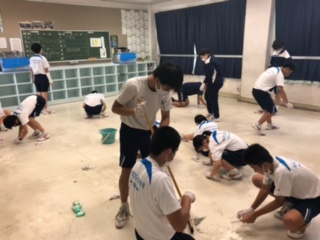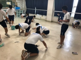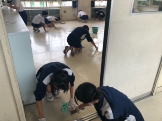 明後日から始まる夏季休業の前に、大掃除を行いました。洗剤とスポンジを使って床の汚れを落としていきます。結構力が必要ですが、みんな頑張っています。