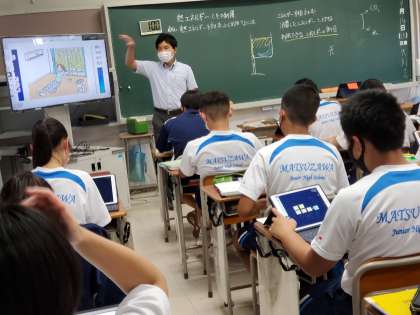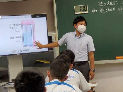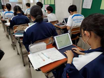 復習をしながら 公開日 2022/09/14 更新日 2022/09/14 できごと 3年の理科、エネルギーの分野です。小学生の時に学習した内容も使います。iPadに熱エネルギーを効率よく利用するにはどうすれば良いか、意見を出し合っています。