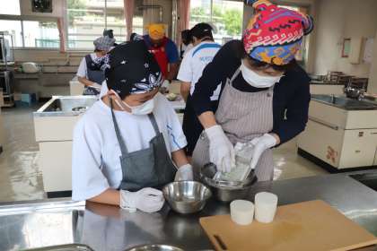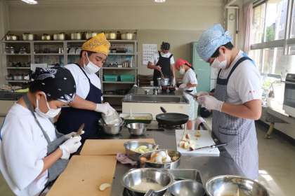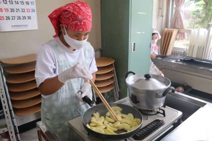 ハンバーグの付け合わせは大根おろしと大葉です。 おろし器の使い方を学びながら作業をしました。