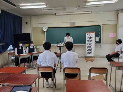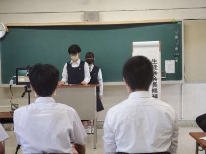 生徒会役員選挙の立会演説会が始まりました。選挙管理委員長の開会あいさつに続いて、会長候補の応援と演説を行っています。
