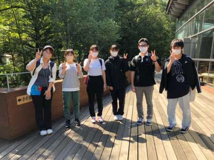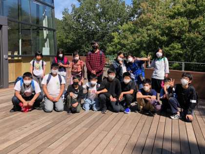 水族館の屋上で記念撮影です。お世話になっている支援員の皆さんも「はい!ポーズ!