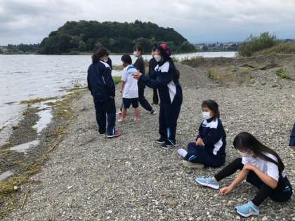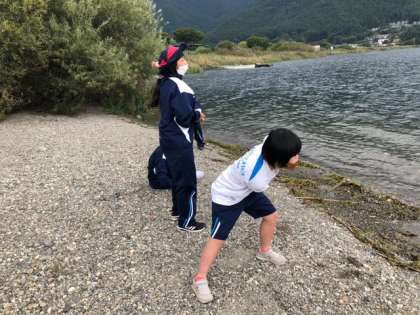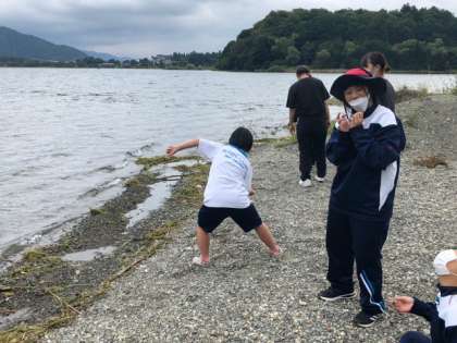 学園に戻ってきてお風呂までの時間に、女子は学園の目の前の河口湖畔へ散歩に行きました。平らな石を見つけて湖面を滑らせます。さて、何回ジャンプできるかな。