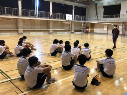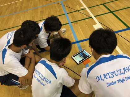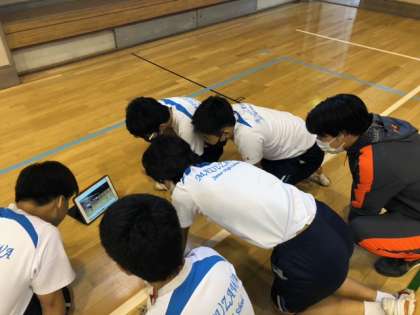 録画したiPadで自分のスパイクしている様子を確認します。画像を見て、みんなであれこれアドバイスし合いました。