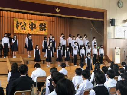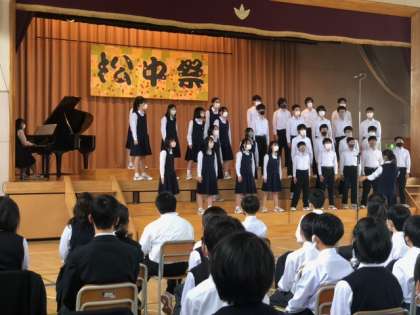 合唱 3年生 公開日 2022/10/15 更新日 2022/10/15 できごと ?いよいよ3年生の発表です。最初のクラスは、休み時間に円陣を組んだ3Cです。女声パートと男声パートのハーモニーが実に美しい合唱でした。