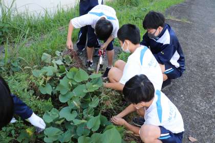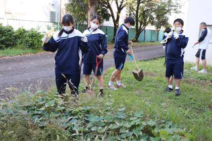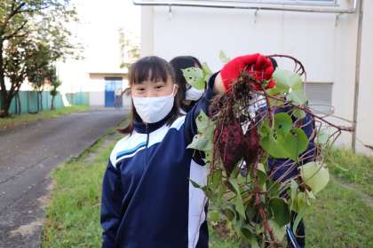 シャベルで土を掘り起こし、一生懸命に芋を探して収穫をしました。