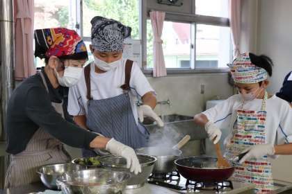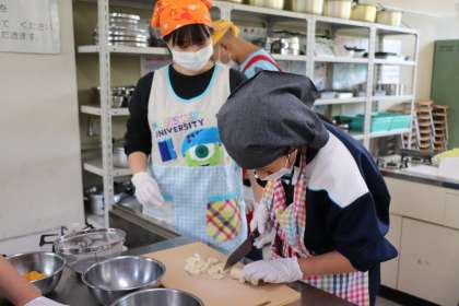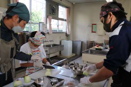 ときわ学級 調理の様子2 公開日 2022/10/21 更新日 2022/10/21 ときわ学級 玉ねぎは1班でハンバーグに3個、スープに3個使います。 全部で18個の玉ねぎを使って作りました。 目が痛い!と言いながらも、落ち着いて切ったり炒めたりすることができました。