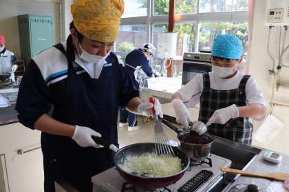 ときわ学級 調理の様子5 公開日 2022/10/21 更新日 2022/10/21 ときわ学級 デミグラスソースは、赤ワインとケチャップ、中農ソース、バターを入れて作ります。 とろみが出るまでしっかりとかき混ぜました。 デミグラスソースはみんなの大好物です。