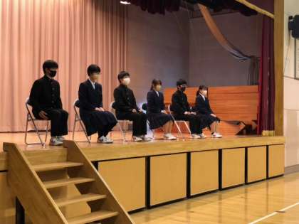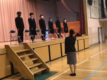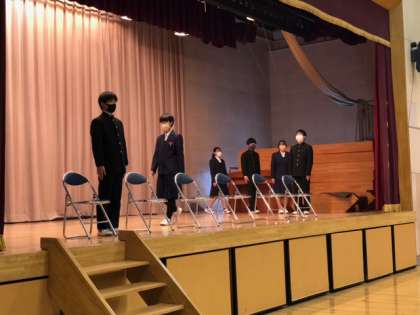 最後に、室内に入ってから着席、退席するまでの一連の流れを復習しました。舞台に上がった生徒たちは、とても緊張している様子でした。