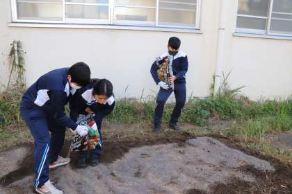 ときわ学級 畑の様子 公開日 2022/11/11 更新日 2022/11/11 ときわ学級 今日は野菜の種蒔きをしました。 さつま芋があった場所を掘り起こし、鍬でうねを作りました。 鍬の扱いは難しいですが、頑張って耕しました。 調理に使えるように、大根や小松菜、蕪にしました。 季節的に蒔くには少し遅いので、カバーをして保温効果を高めてみました。 無事に大きく育つといいですね。
