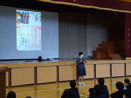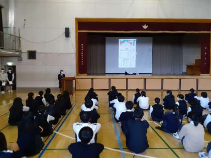 6時間目に2年生の職場体験学年発表会がありました。各クラス3名の代表者がとても立派な発表をしてくれました。作った新聞をうまくつかった発表、クイズ形式で行う発表、職場の人に教えてもらった技術を披露してくれた発表など、個性豊かでみなさんとても素晴らしかったです。