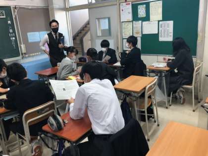 倫理の授業では「弁証法」について学びました。授業の最後は、論理を組み立てて結論付けるグループワークを行なっていました。生徒たちは活発に話し合い活動を進めていました。